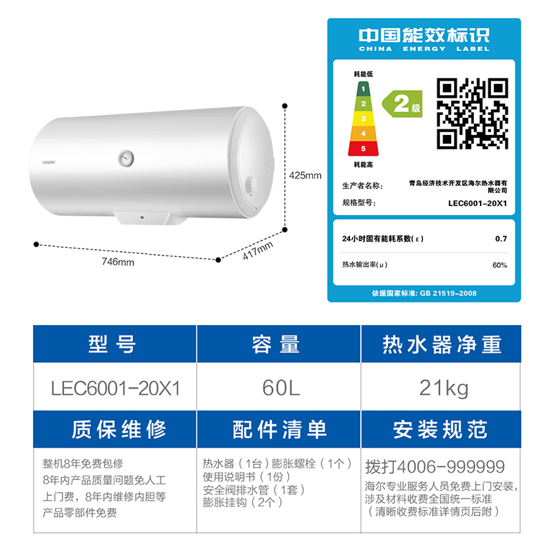 Leader (Leader) Haier produced electric water heater 60 liters small energy-saving home bathroom shower bath x1