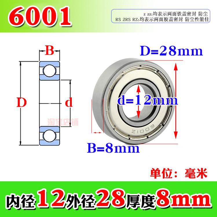 Deep groove ball miniature small bearing 6001Z ZZ 6001RS 2RS RZ inner diameter 12mm outer diameter 28 thickness 8mm