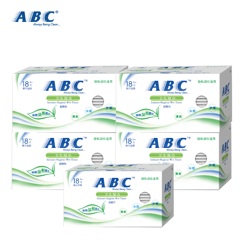 ABC Female Australian Tea Tree essence Care Private Office Clean Disinfection Care Wet Tissue Paper 18 slices * 5 boxes