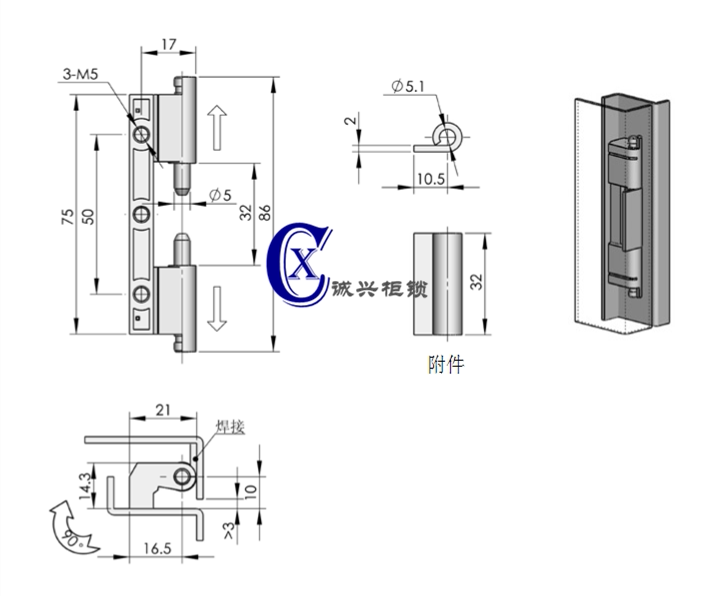 Removable double nail plug-in non-porous welding hinge CL201-6 industrial equipment box hinge power distribution cabinet hinge