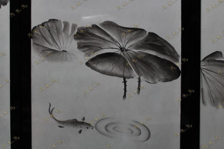 New Chinese Hand Painted with Lotus Flower Fish White Vegetarian Lacquer Painting Hotel Tea Gallery Solid Wood Frame Folded Zen screen