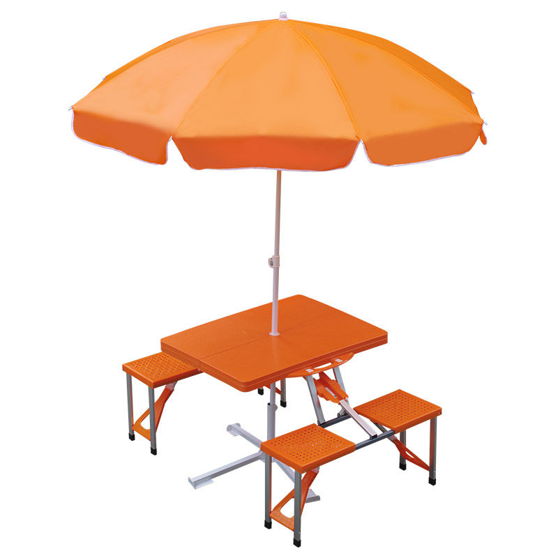 Fluorescent orange portable table and chair + umbrella