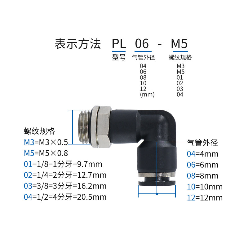 Black pneumatic quick connector elbow with sealing ring thread PL4-M5 6-01 8-02 10-03 12-04