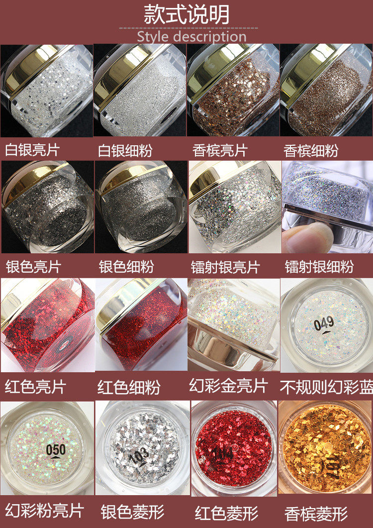 Silver bright (large cans 15ML) silver fine powder (large cans 15ML) Champagne bright piece (large cans 15ML) Champagne fine powder (large cans 15ML) silver bright piece (large cans 15ML)