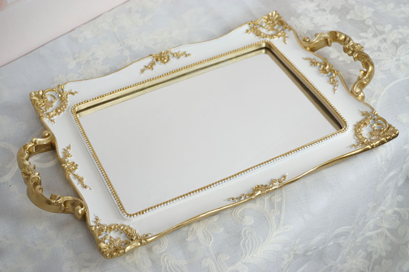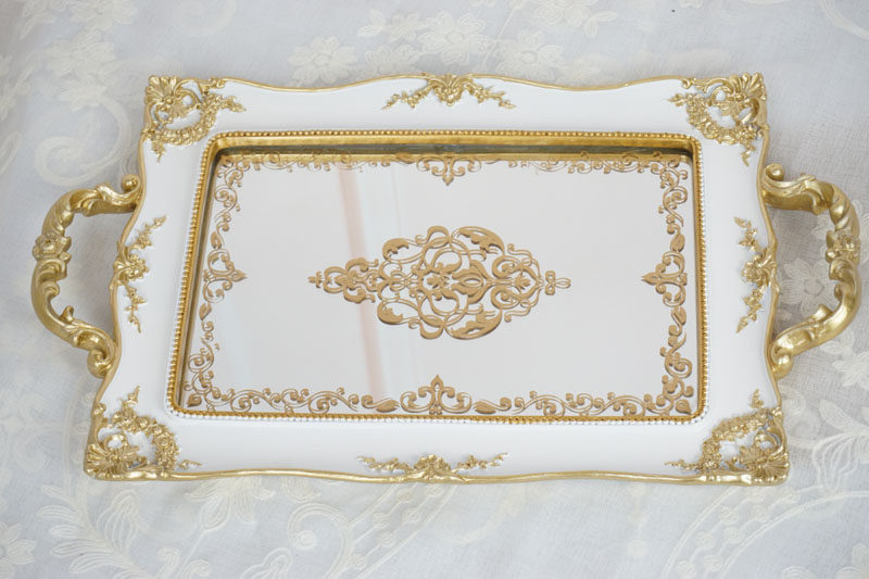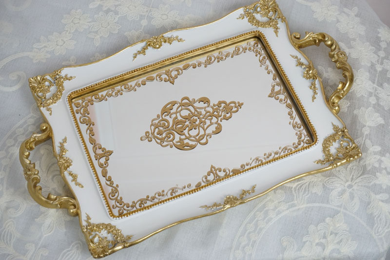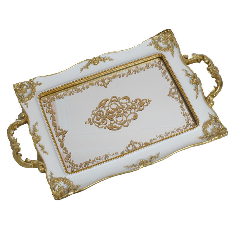 Exit tail Single European style palace retro made of old ivory white palace Palace Wind Carving Flower Sketching golden Mirror Resin Nursery Tray