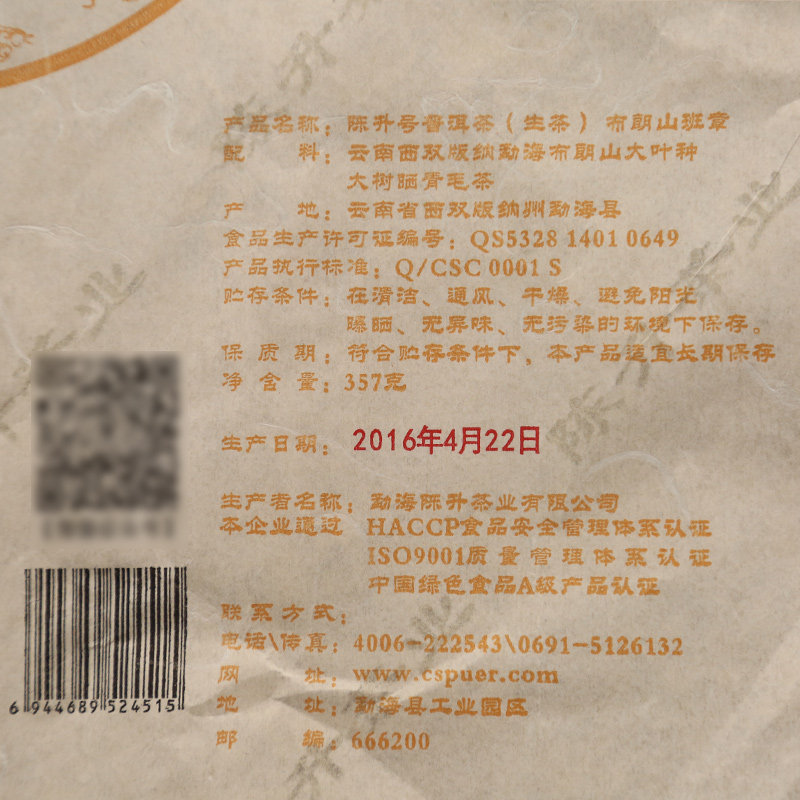 2016 Chen Sheng's Big Four Base Class Chapter Pu'er Health Tea