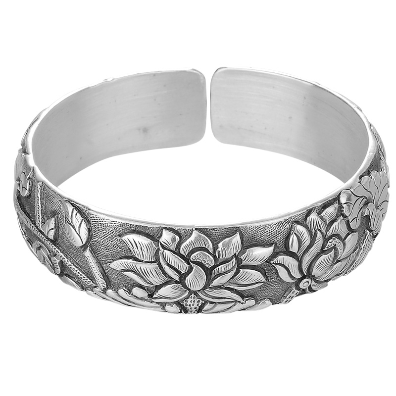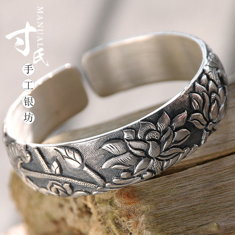 Handmade silverware 999 sterling silver lotus bracelet embossed lotus S999 foot silver snowflake silver Sterling silver bracelet vintage