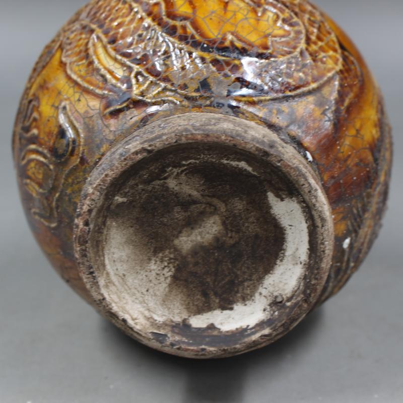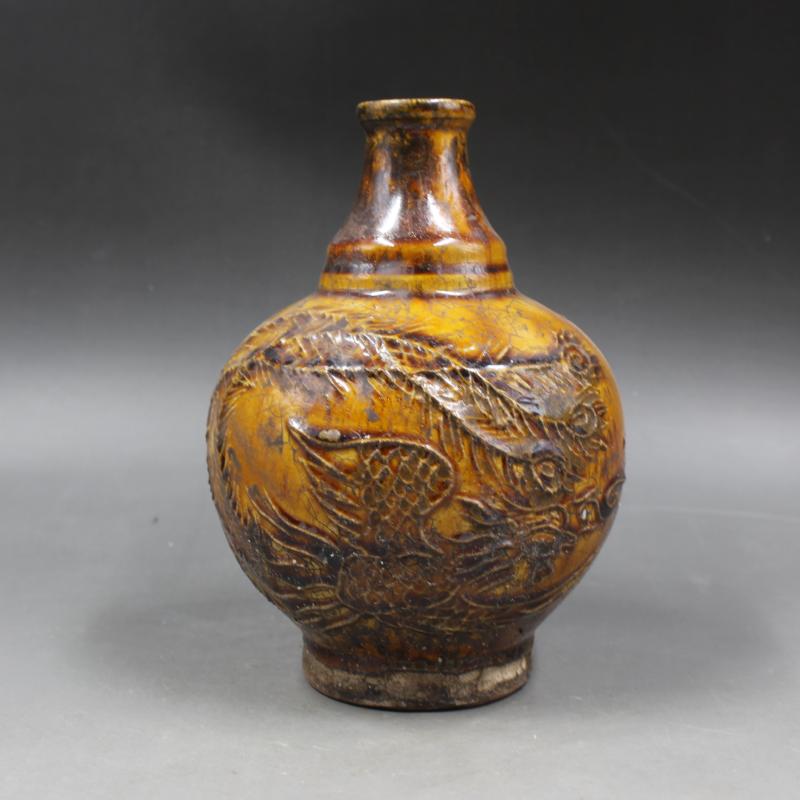 Song Guizhou Kiln Yellow Glazed Carving Dragon Pineapple Flower Arrangement Bottle Imitation Ancient Porcelain Antique Ancient Play With Old Household Goods