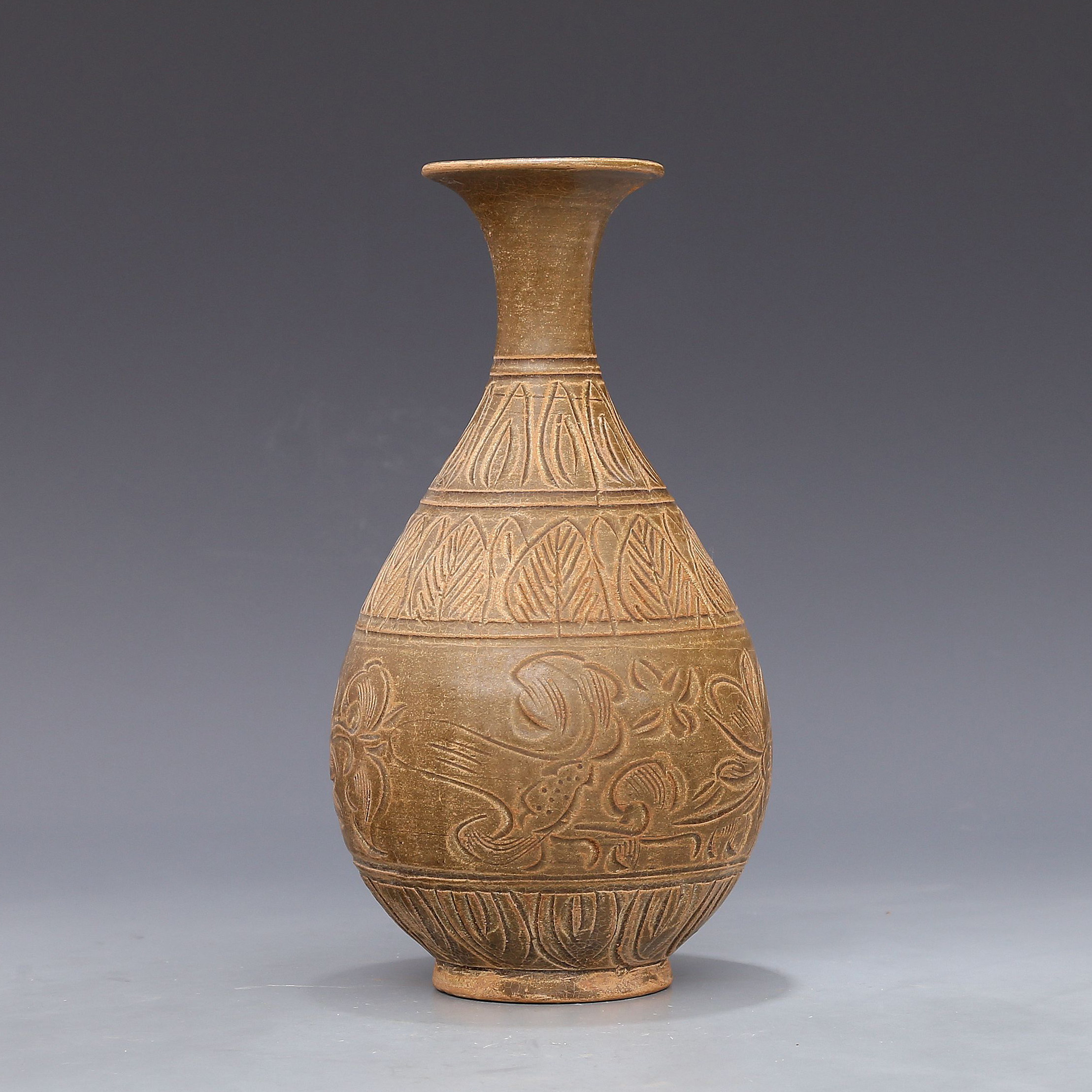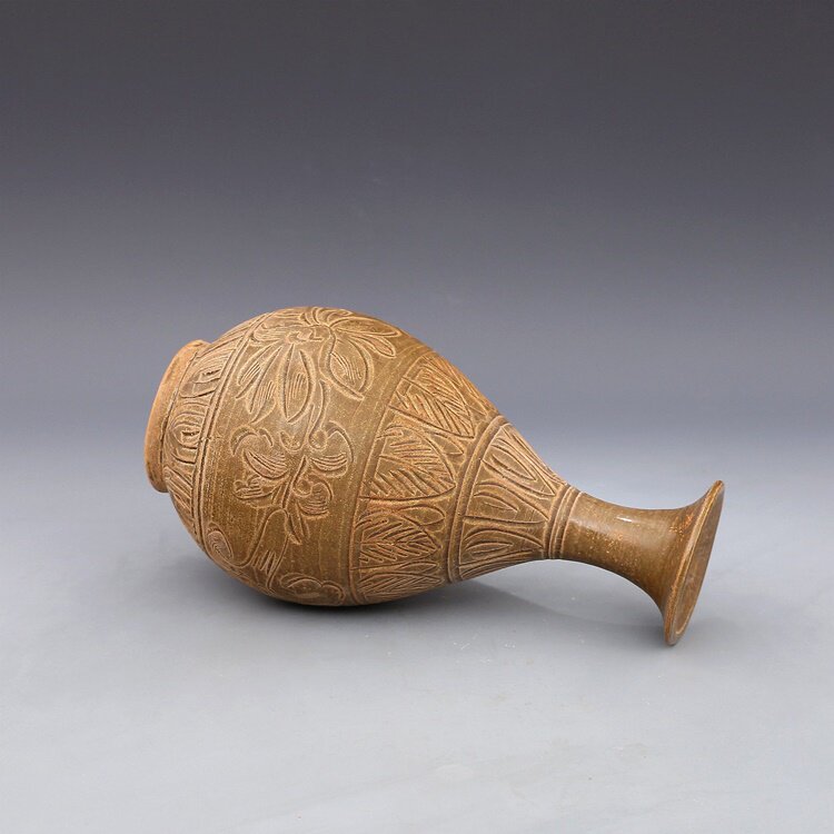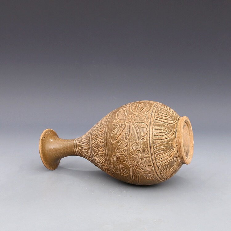 Southern Song Yaozhou kiln carved lotus peony pattern jade pot Spring bottle antique porcelain antique antique porcelain collection
