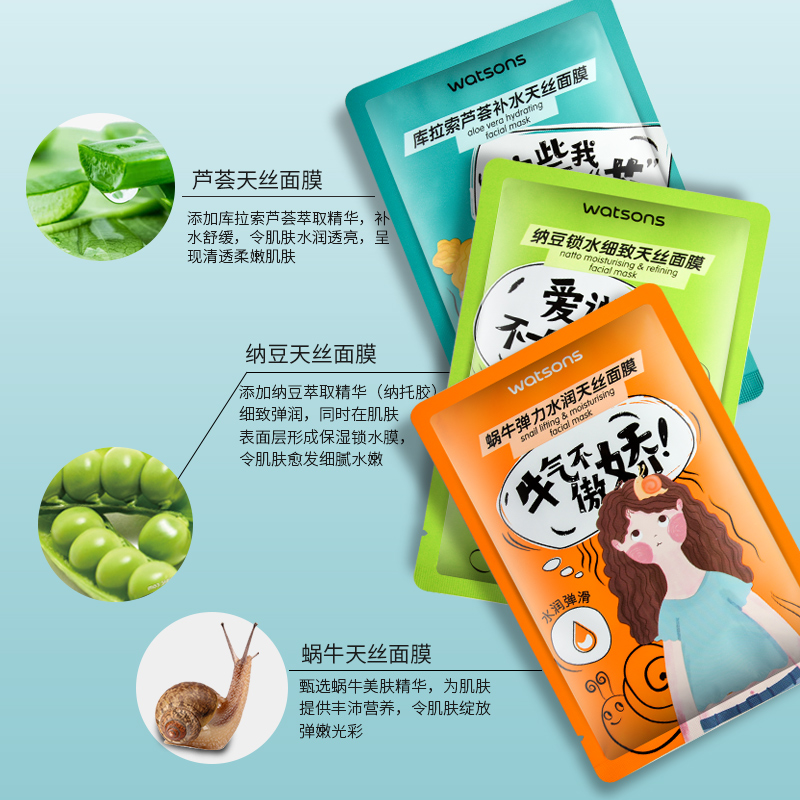 Watsons Tencel Mask Moisturizing 10 Pieces Aloe Vera Hyaluronic Acid Snail Cucumber Natto Milk