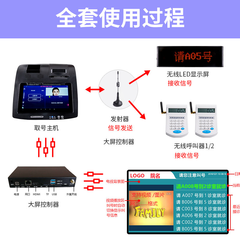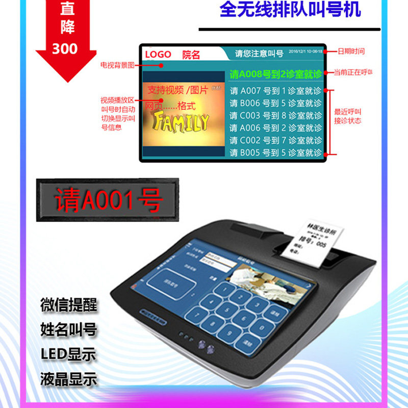 Hospital Wireless queuing number called number machine room visit called number instrumental outpatient clinic and other places called clarifier queuing to pick up the number machine self-taking the number is called number device WeChat check the number of the number is called No.