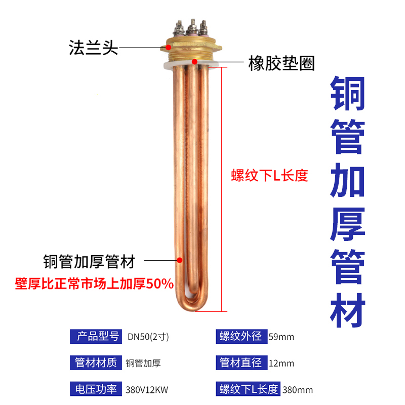 Stainless steel head electric boiler high power electric heating tube DN50 engineering water tank heating Rod 220V 380V 12kw