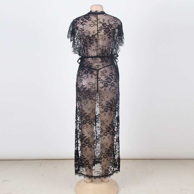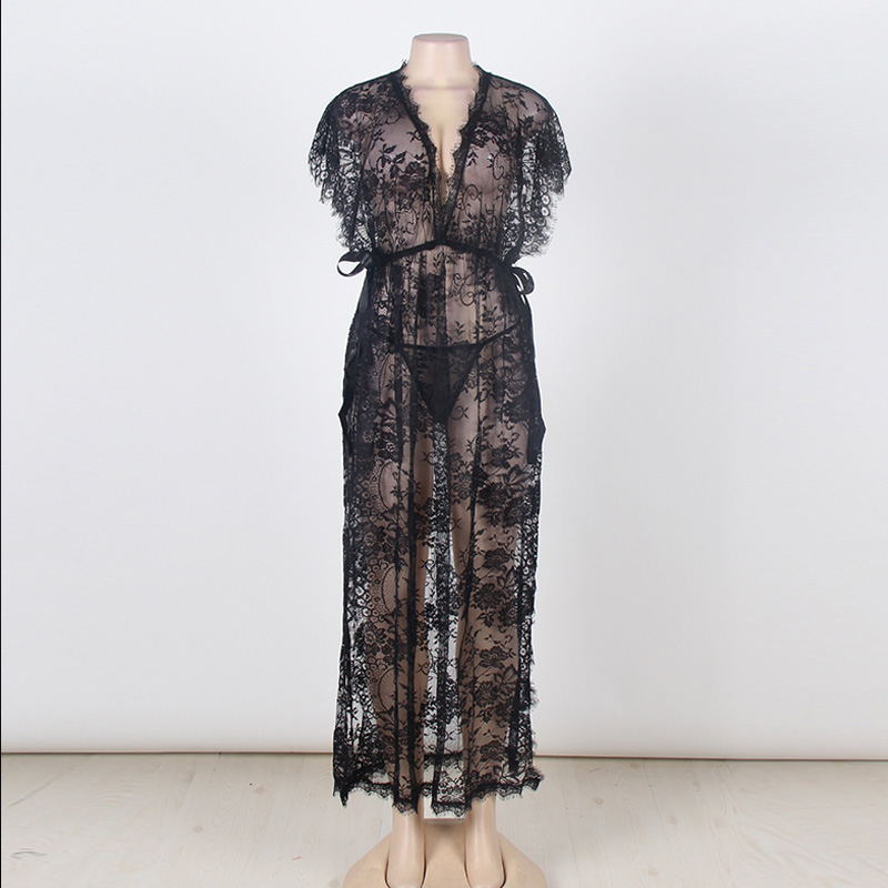 Large size Sexy Sleeping Skirt Open Flap Long Sleeves Black Lace Long Version Pyjamas Eroy Underwear Perspective Seductive Lady Long Dress