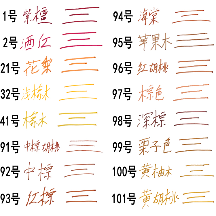 No. 120 Black 1, No. 2, Red 21, No. 32, Palm Oak No. 41, No. 91, No. 92, No. 93, No. 95, No. 95, No. 95, Red Brown 94, No. 91