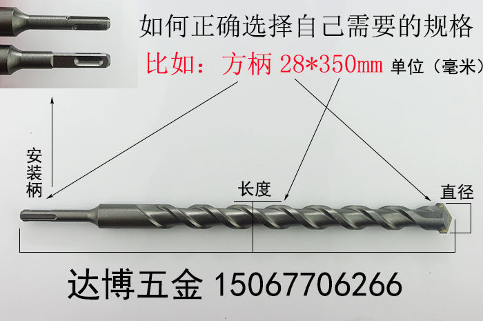 Electric hammer drill bit two pits two-groove round handle concrete four-pit square handle shock drill bit 350mm lengthened wearing wall cement