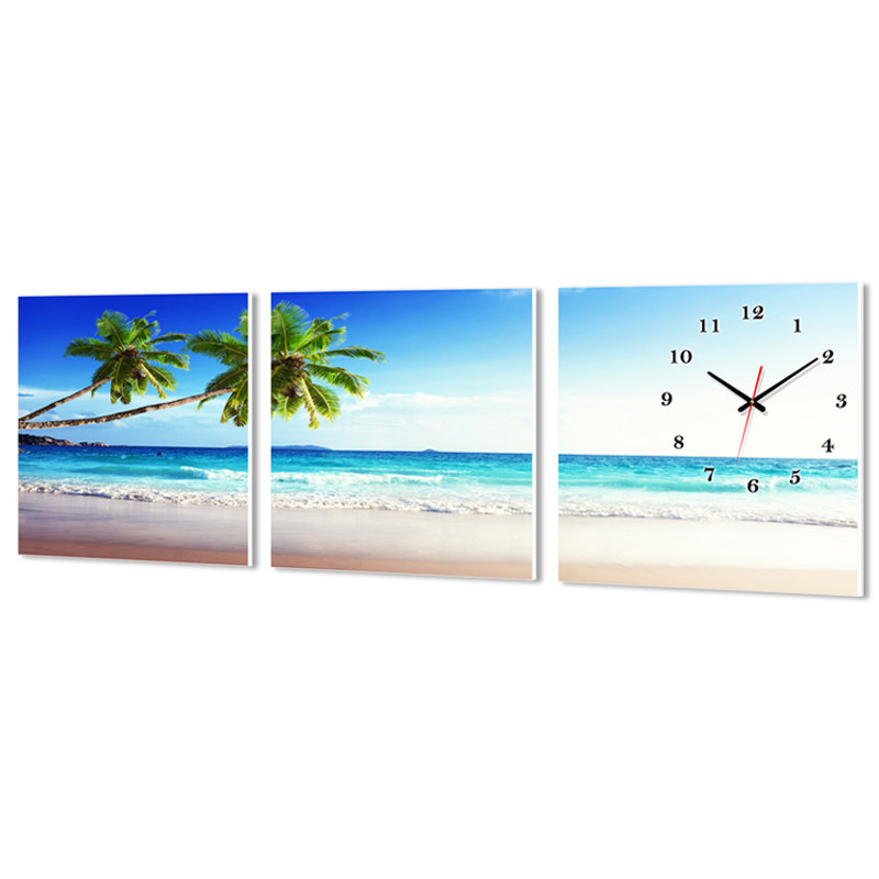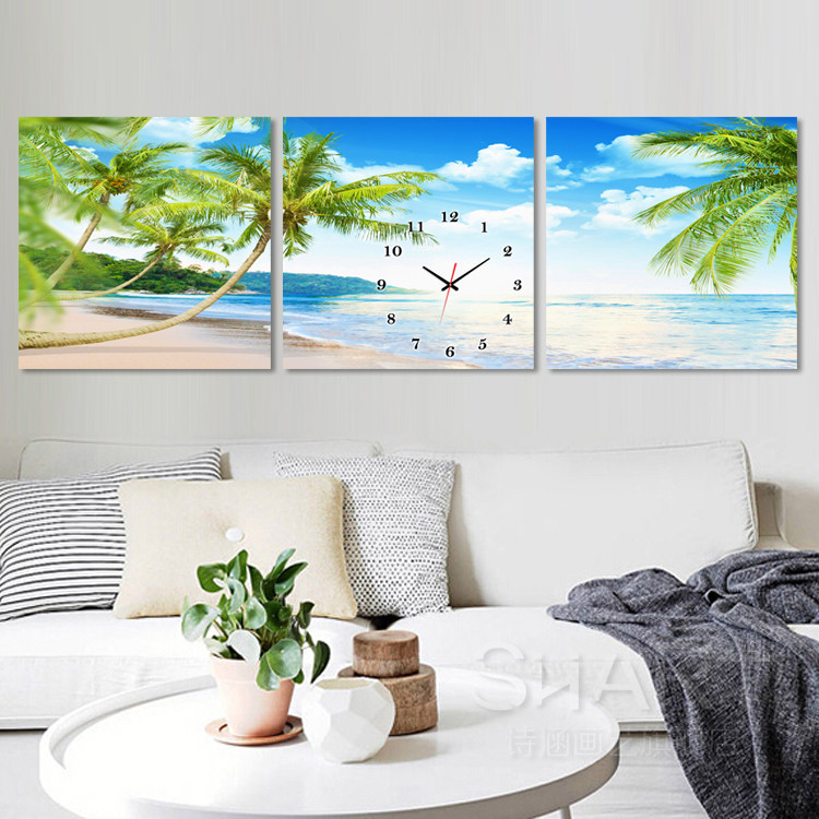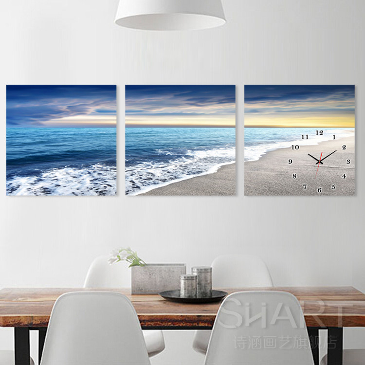 Frameless painting Wall clock triptych Bedroom bed hanging painting Living room clock painting Dining room mural Seaside landscape Crystal painting