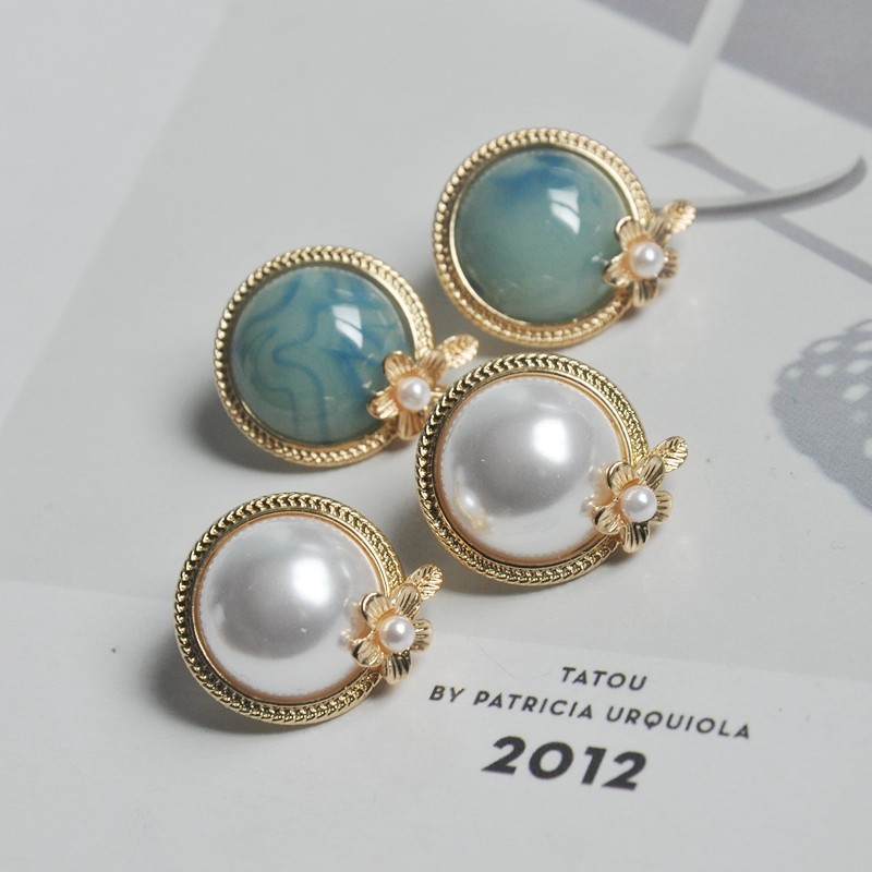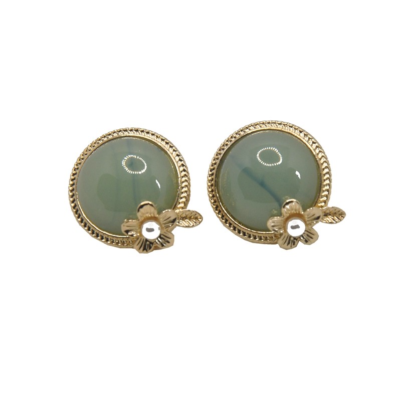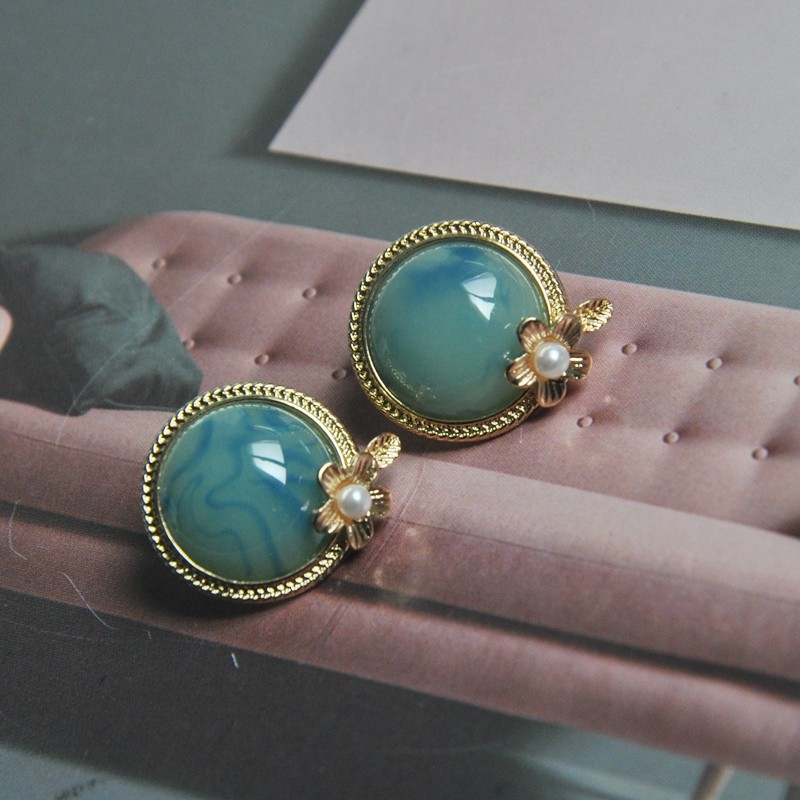 Qiujia classical Hepburn small fragrance pearl flower imitation jade resin gem big ear clip 925 silver needle ear needle