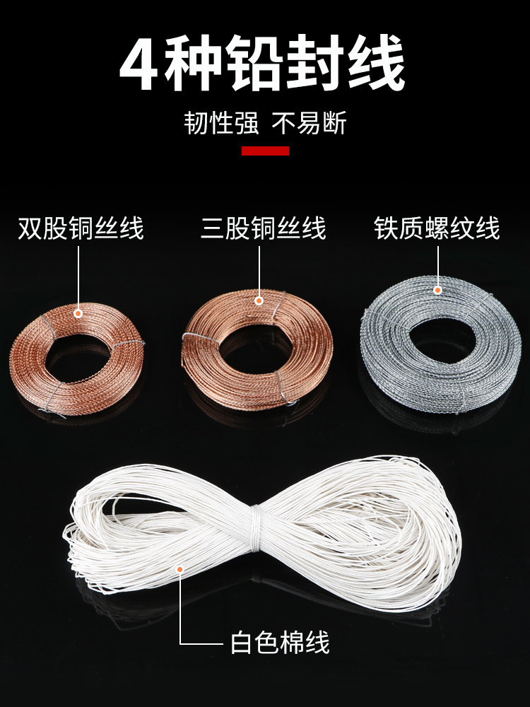 Cotton wire + lead seal pliers + lead seal iron wire + lead seal pliers + lead seal two strands of copper wire + lead seal pliers + lead seal three strands of copper wire + lead seal pliers + lead seal anti-theft lead seal pliers 6 *4 lead seal one pound (about 500 pieces) 8 *4 lead seal one pound (about 300 pieces) 9 *4 lead seal one pound (about 200 pieces) cotton wire (100 meters) iron wire (50 meters) double strand copper wire (30 meters) upgrade three copper copper wire (40 meters)