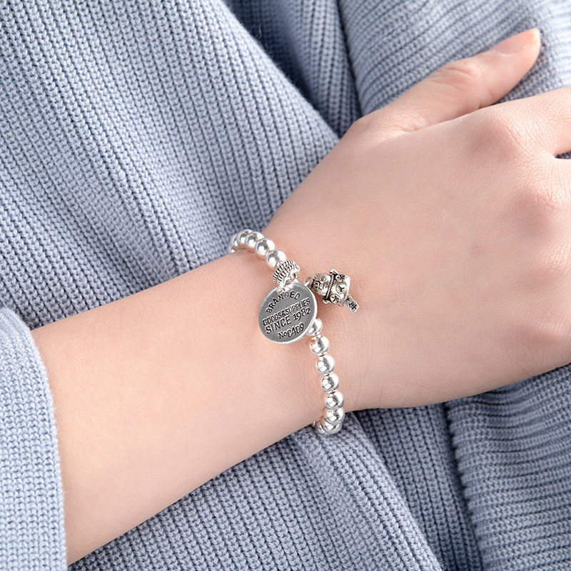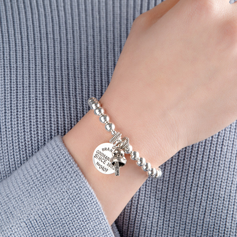 S925 Sterling Silver Lucky Cat Bracelet Men's and Women's Thai Silver Retro Round Card Manual Transfer Silver Bead Bracelet Birthday Gift
