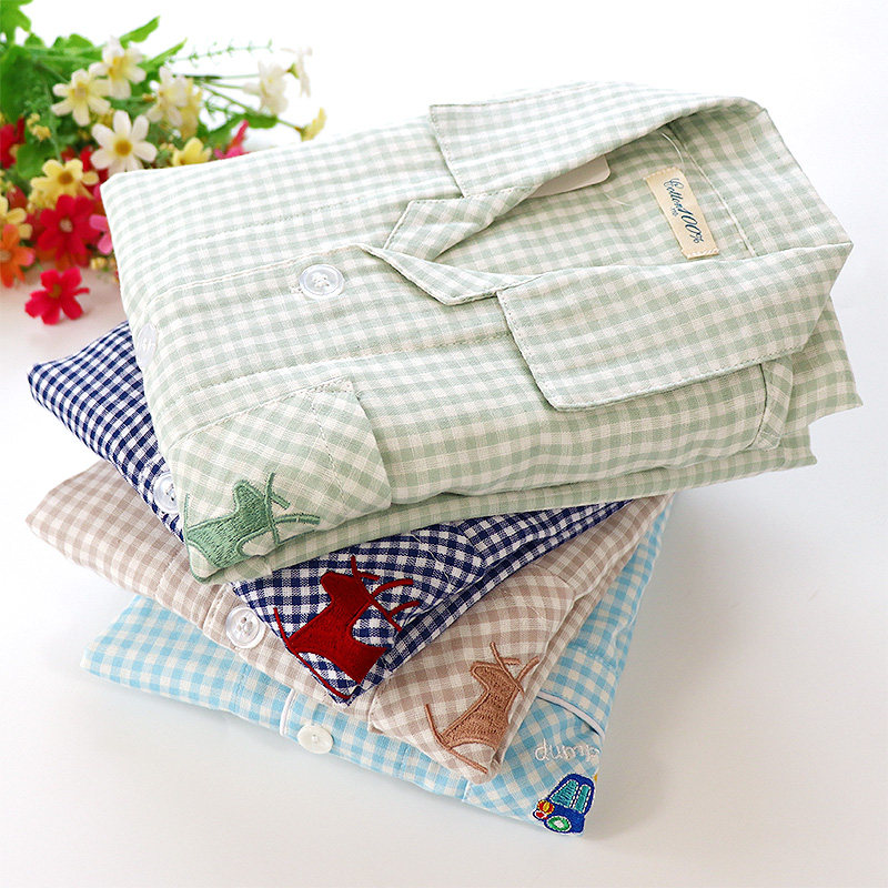 Spring and summer boys short-sleeved long-sleeved trousers pajamas Cotton gauze Children's fresh plaid soft home clothes