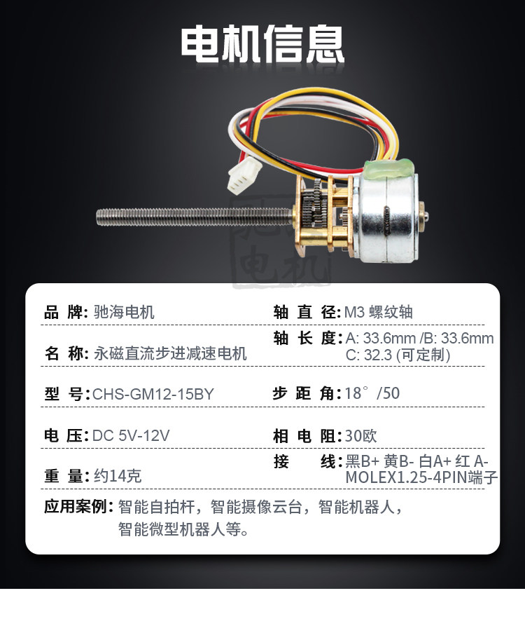 The Chi Hai factory direct sales GM12 15BY stepper DC speed reduction motor with M3 threaded shaft monitor holder