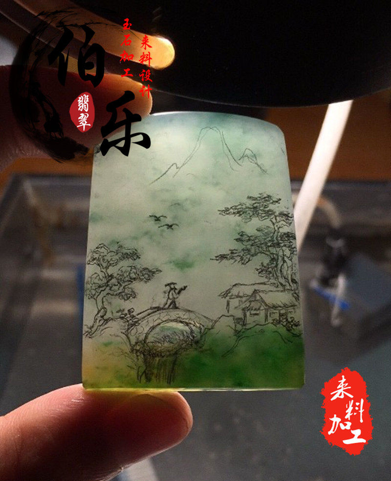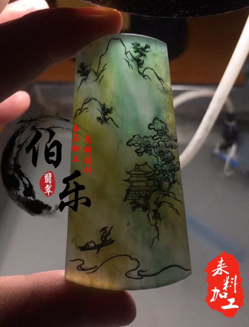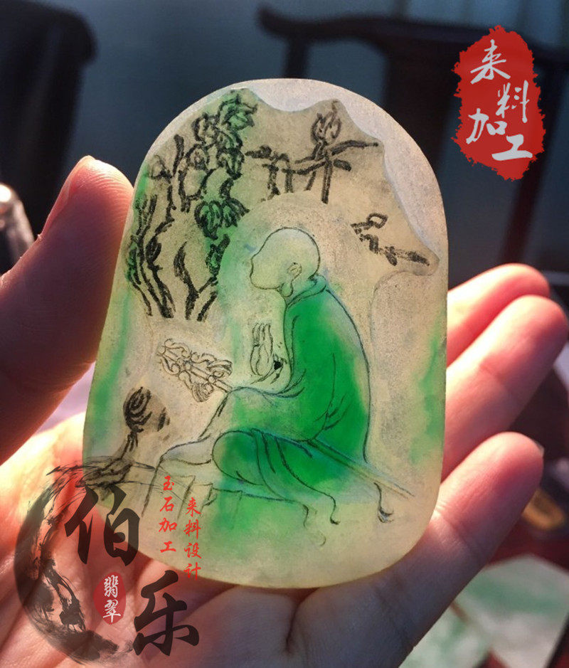 Emerald engraving jade processed raw stone wool custom brand hand play piece landscape Guanyin lotus monk design picture
