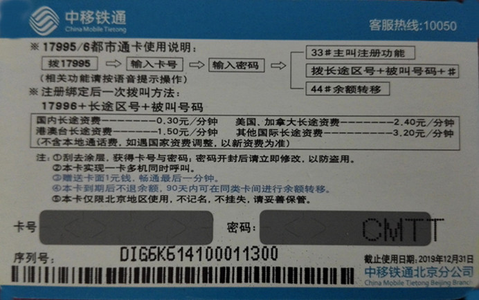 Beijing railway 17995 zhang turcar IP card for international and domestic zhang turcar expiration date 2020-12-31