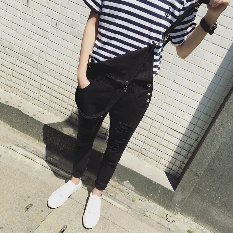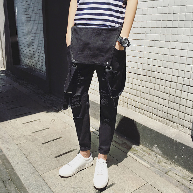 Spring and Autumn Youth Hole Suspension Pants Men Korean Slim Small Feet Casual Pants One-piece ankle-length pants Backbelt Pants Tide