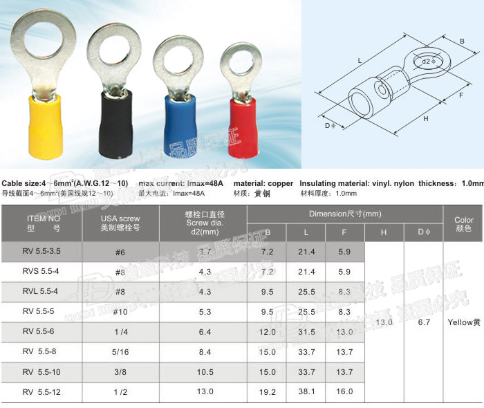 Cold pressure terminal 12-10 RV5 5-4S round pre - insulated end brass press wire electrical terminal