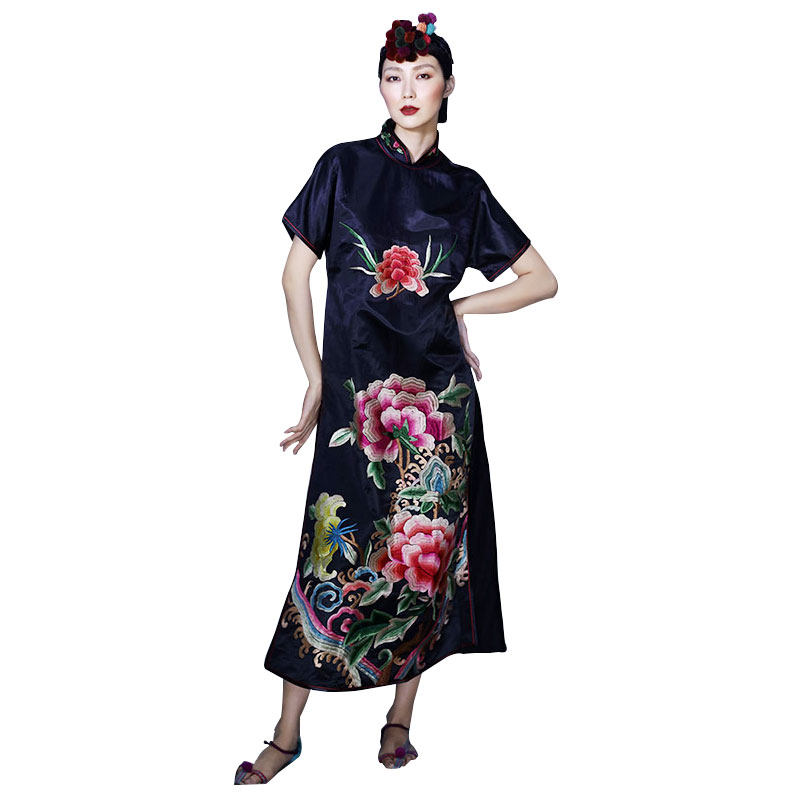 Cloud decoration totem original design women's robe Ethnic style Silk satin Chinese Peony short-sleeved robe dress