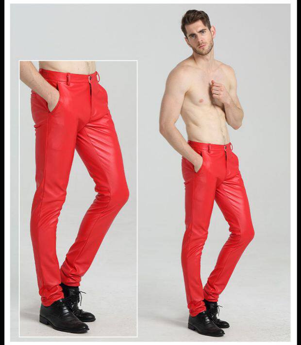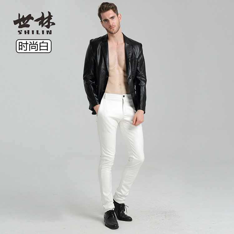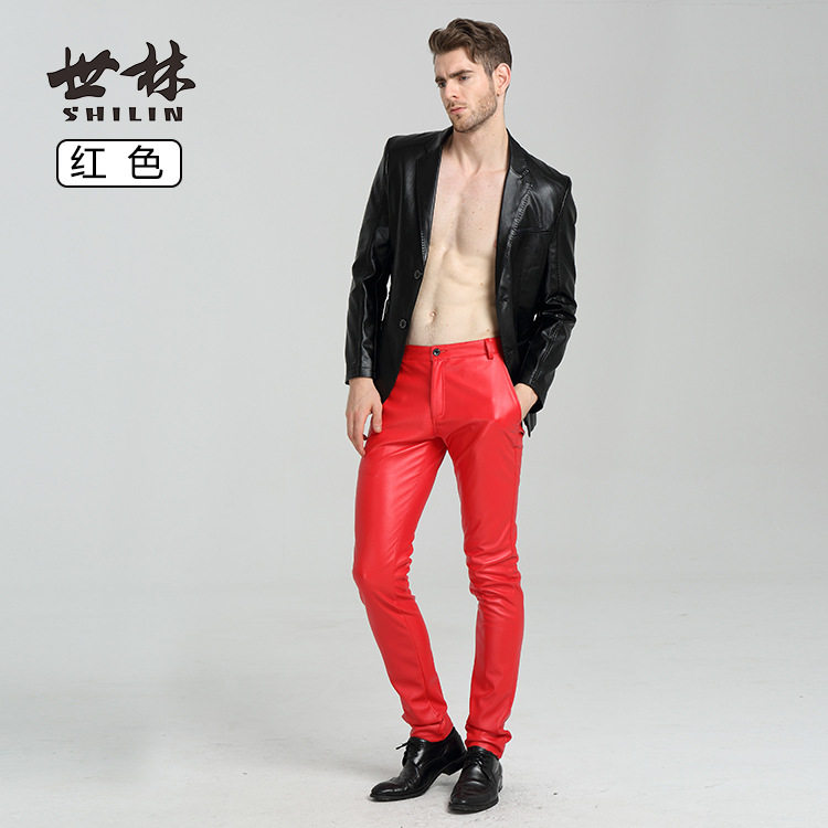 Shilin spring and autumn thin personalized men's leather pants black stretch tight blue white red motorcycle PU