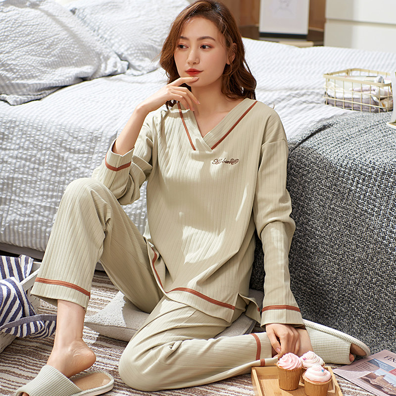 Spring Autumn Pyjamas Woman Pure Cotton Long Sleeve Long Pants Suit Fall Full Cotton Home Clothing V Collar Cover Middle-aged Mom's summer