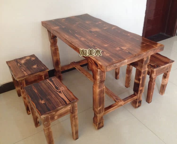 Hotel full solid wood dining table and chair combination carbonized long table for 4 people Dining room table stool set Leisure farm long table