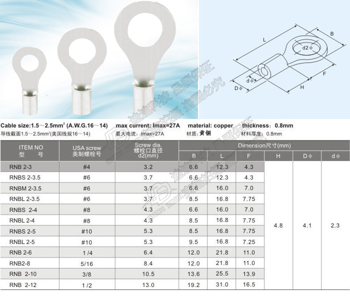 Cold Press Terminals Round Bare End Head RNB2-5S 16-14 OT Type Copper Wire Nose Wiring Head Brass