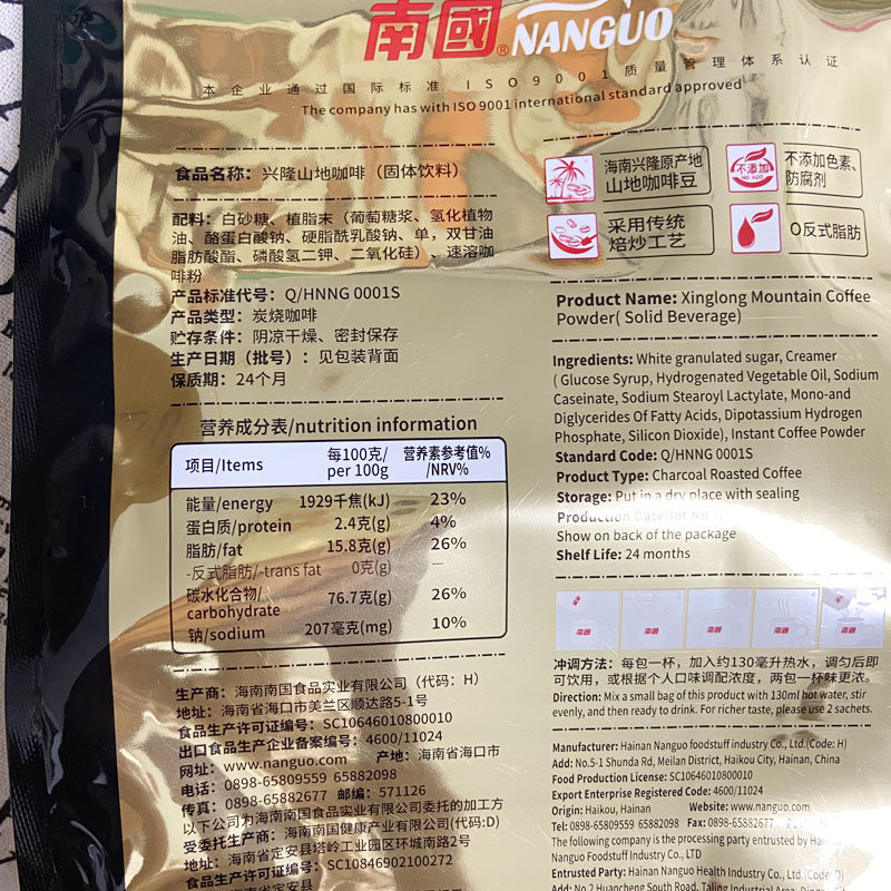 Hainan specialty Nanguo Xinglong Mountain Coffee 306g instant three-in-one coffee