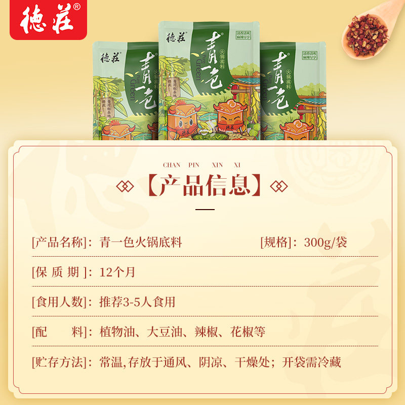 3 bags) Chongqing Dezhuang green one color vine pepper hot pot base 300g green peppercorn hemp pepper fish clear one color base