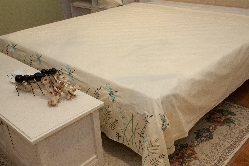 A single bed with 2 pillow sleeves