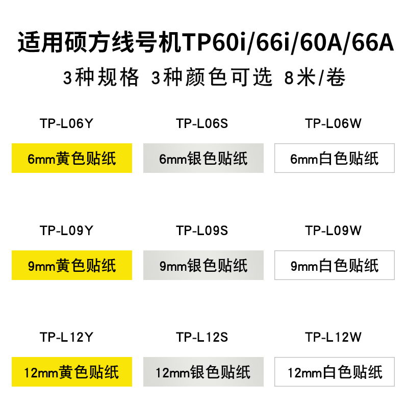 TP-L06W 6MM White TP-L09S 9MM Silver TP-L06Y 6MM Yellow TP-L12W 12MM White TP-