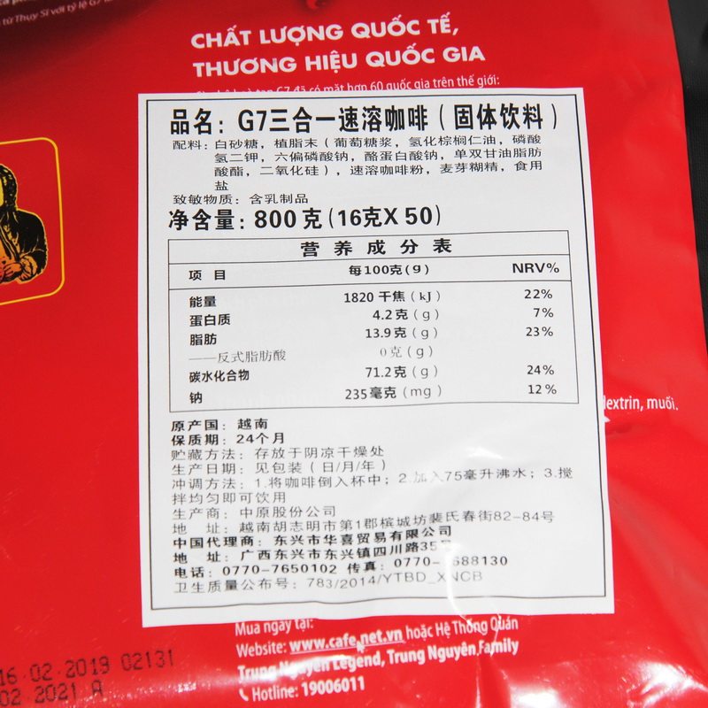 Vietnam imported Zhongyuan G7 coffee 800g three-in-one instant coffee bag 50 packets fragrant coffee Vietnamese version