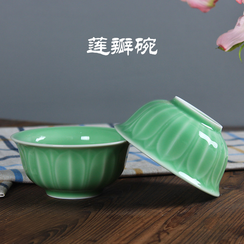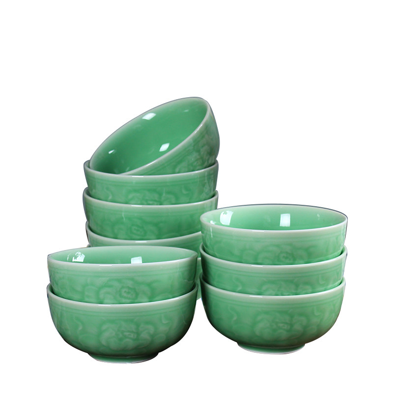 Ceramic bowl 10 packs Longquan celadon household bowl environmental protection tableware rice bowl 4 5 inch rose peony lotus bowl