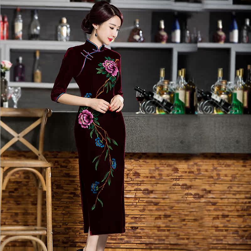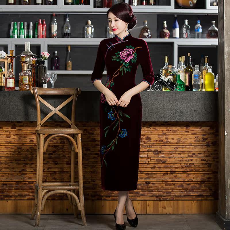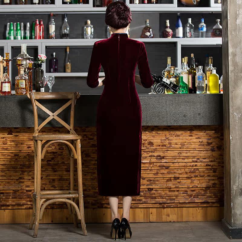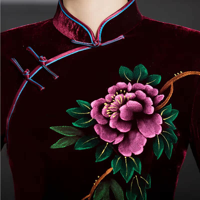 (Cheongsam off-code clearance)Gold velvet hand-painted medium-long mom wedding wedding mother-in-law dress