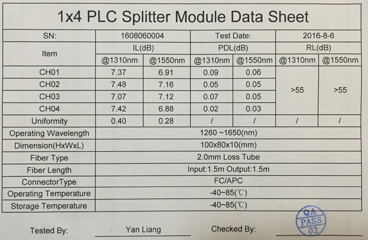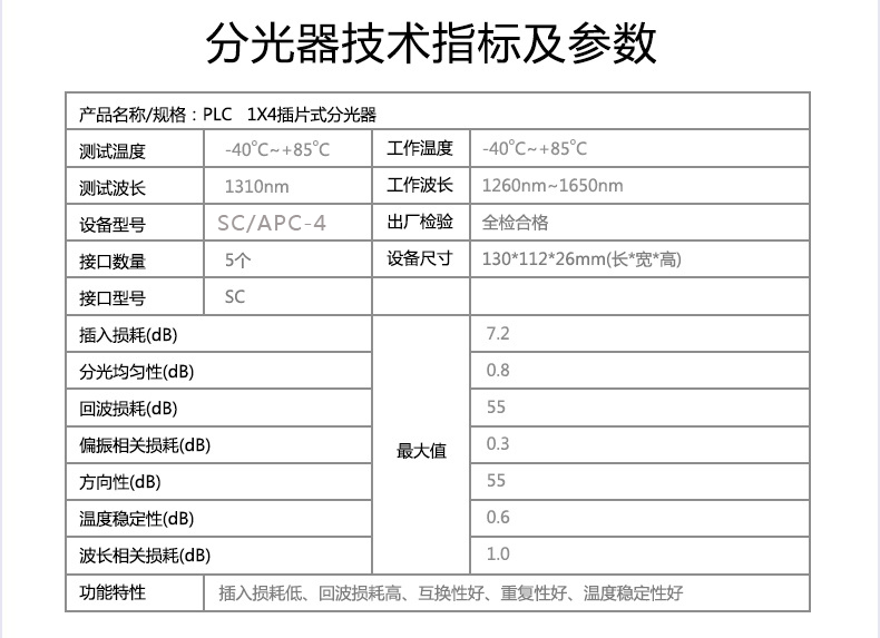 Wide-electric class light splitter 1X4 splitter FC APC cassette with tail fiber single-mold round head cable cablehead