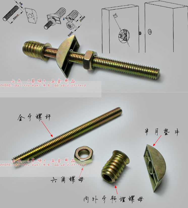 Furniture four-in-one half-moon connector M8 Taipan countertop connector full tooth rod hexagonal nut internal and external teeth