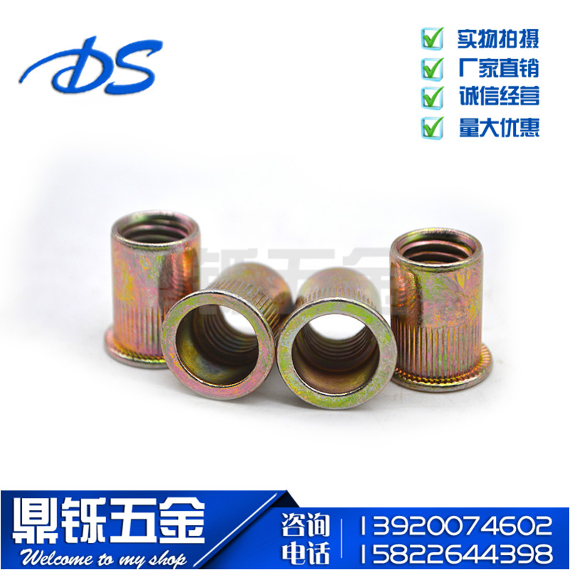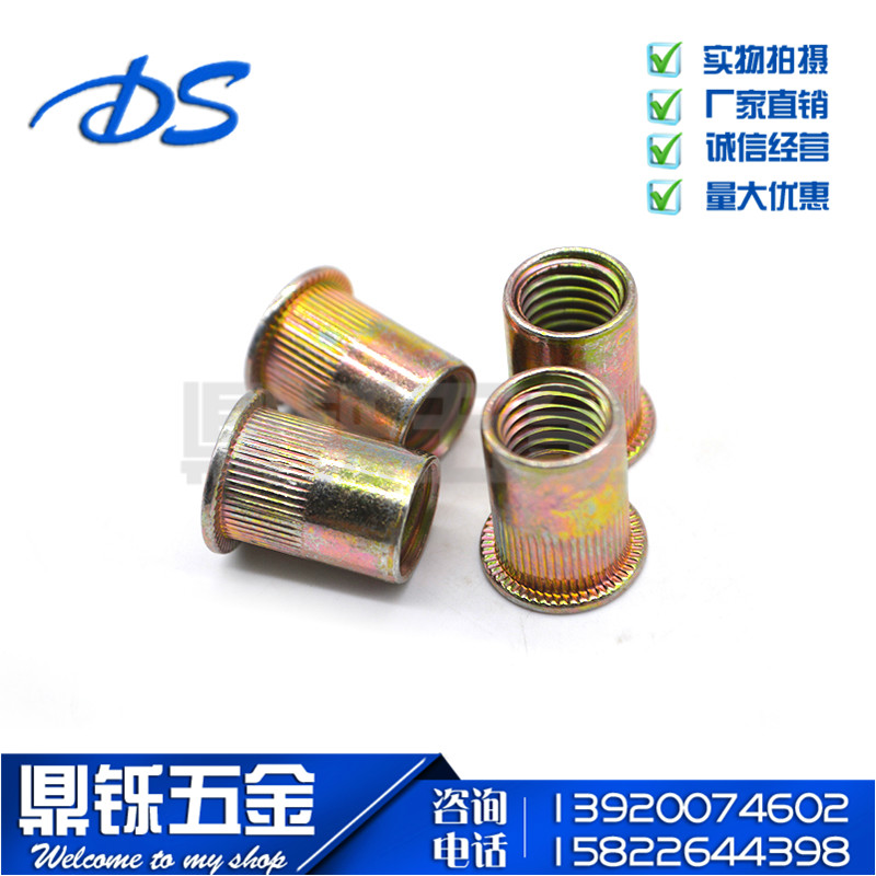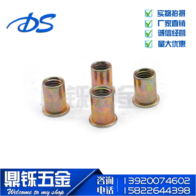 Cylindrical rivet nut Rivet nut Flat head column rivet nut Rivet cap Color zinc knurled rivet nut