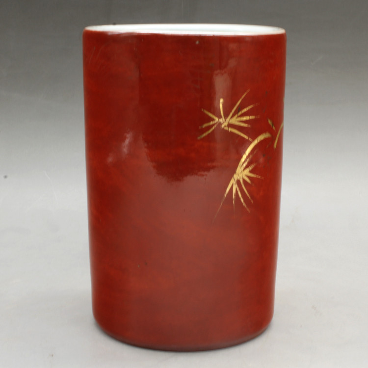 Late Qing Hongde red glaze sketch golden pine crane pen holder ancient play porcelain antique antique vintage room swing piece collection