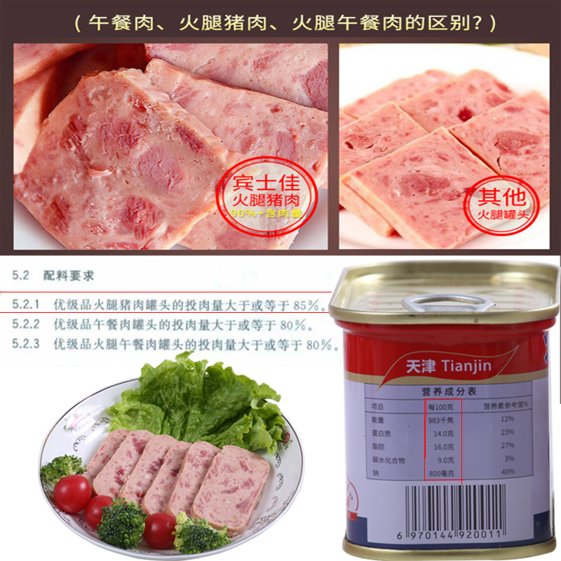 Tianjin specialty Binshijia canned ham and pork canned outdoor ready-to-eat luncheon meat 198g*18 cans