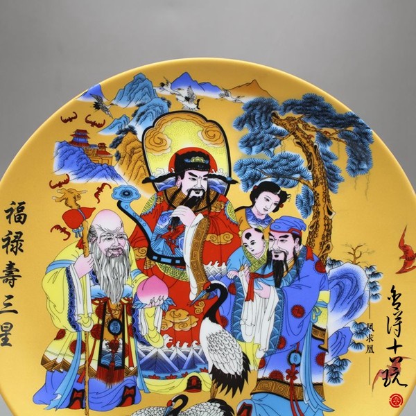 Fine ceramics Yellow bottom Fu Lu Shou Samsung porcelain plate Bogu frame decorations 26CM sitting plate hanging plate swing plate