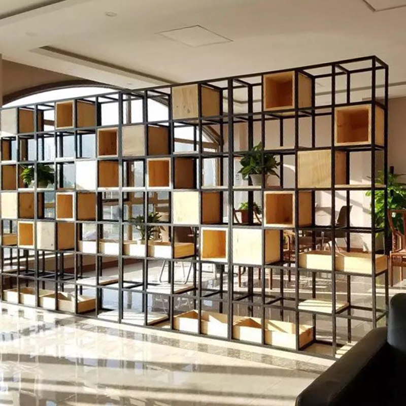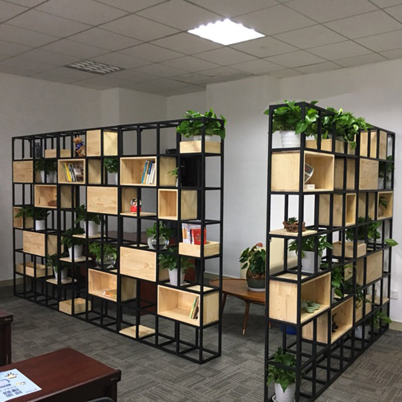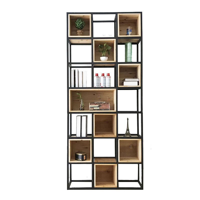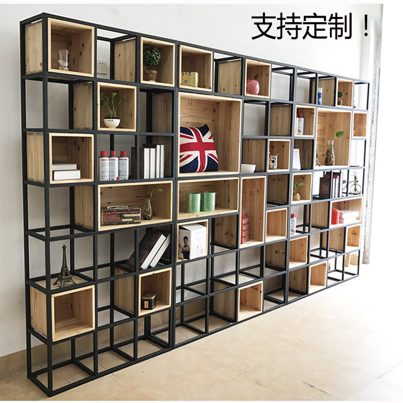 Loft American creative bookshelf rack wrought iron solid wood floor bookcase screen rack display rack partition