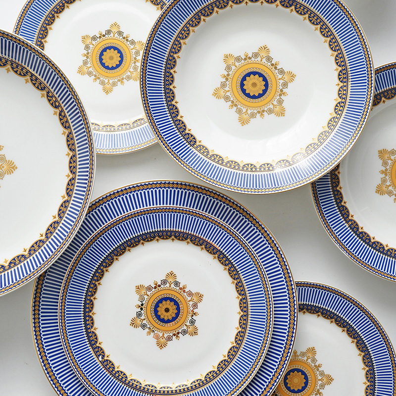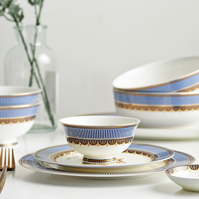 Tangshan Jiayu Bone Porcelain Light Luxury Simple Europe 50 Blue Ceremony Tableware Set Dishes Embossed Ceramic Tableware
