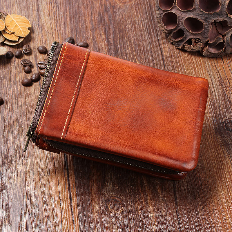 Handmade cowhide men's wallet retro old vertical buckle zipper coin purse short multi-card leather wallet